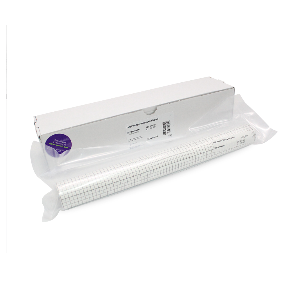 PVDF免疫印迹膜是疏水性的聚偏二氟乙烯(PVDF)微孔膜,孔径为0.2μm。PVDF免疫印迹膜适用于蛋白质免疫印迹和斑点杂交印迹。PVDF膜具有高结合能力、高机械强度和耐化学腐蚀性,因此,特别适用于蛋白质印迹。强大的样品保留性和低背景结合,使其在比色和化学发光检测中具有出色的信噪比。主要结合原理包括静电吸附和疏水作用。