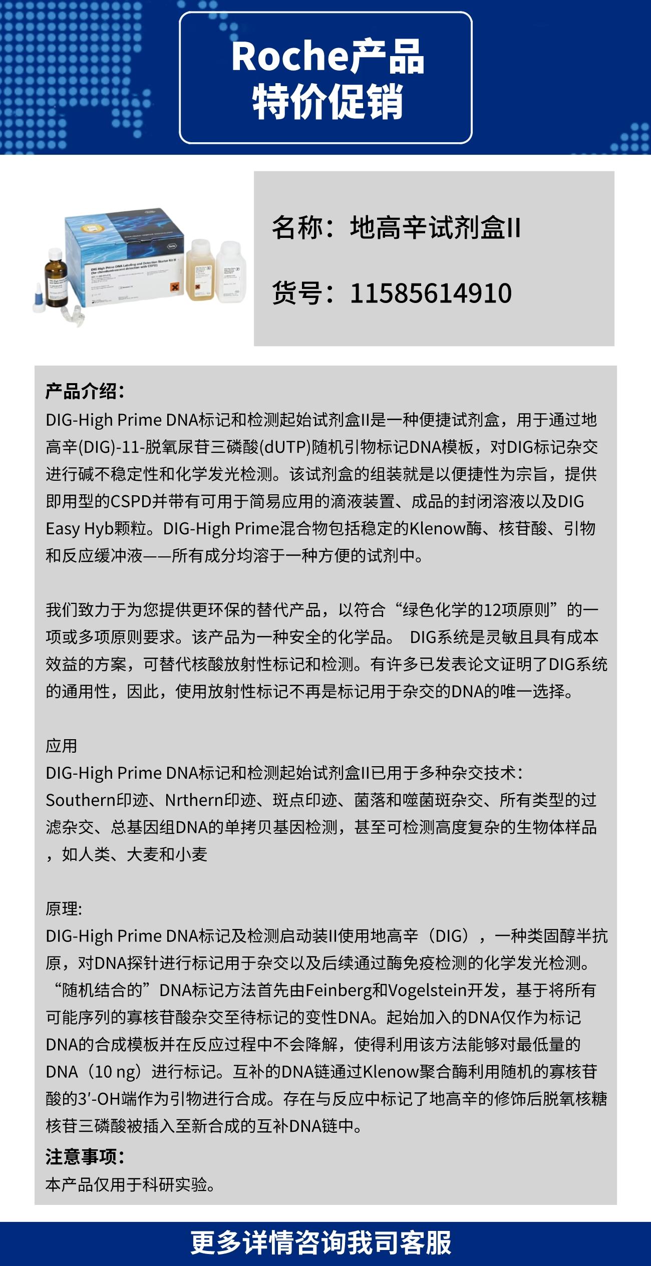 DIG-High Prime DNA标记及检测启动装II使用地高辛(DIG),一种类固醇半抗原,对DNA探针进行标记用于杂交以及后续通过酶免疫检测的化学发光检测。“随机结合的”DNA标记方法首先由Feinberg和Vogelstein开发,基于将所有可能序列的寡核苷酸杂交至待标记的变性DNA。起始加入的DNA仅作为标记DNA的合成模板并在反应过程中不会降解,使得利用该方法能够对最低量的DNA(10 ng)进行标记。互补的DNA链通过Klenow聚合酶利用随机的寡核苷酸的3′-OH端作为引物进行合成。存在与反应中标记了地高辛的修饰后脱氧核糖核苷三磷酸被插入至新合成的互补DNA链中。