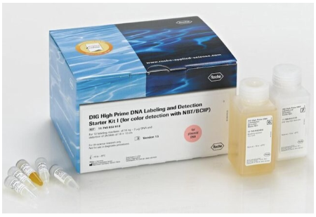 The DIG High Prime DNA Labeling and Detection Starter Kit I uses digoxigenin (DIG), a steroid hapten, to label DNA probes for hybridization and subsequent color detection by enzyme immunoassay. This kit contains a ready-made blocking solution, combined stock solution of of nitroblue tetrazolium (NBT)/ 5-bromo-4-chloro-3-indolyl-phosphate (BCIP) and DIG Easy Hyb granules. The DIG-High Prime mixture includes stabilized Klenow enzyme, nucleotides, primers and reaction buffer, all in one convenient reagent. The sample material can be: DNA fragments of at least 100bp, linearized plasmid, cosmid or λDNA, or supercoiled DNA. The "random primed" DNA labeling method originally developed by Feinberg and Vogelstein is based on the hybridization of oligonucleotides of all possible sequences to the denatured DNA to be labeled. The input DNA serves as a template for the synthesis of labeled DNA and is not degraded during the reaction, making it possible to label minimal amounts of DNA (10ng) with this method. In this method, the complementary DNA strand is synthesized by Klenow polymerase using the 3′-OH termini of the random oligonucleotides as primers. Modified deoxyribonucleoside triphosphates, labeled with digoxigenin, present in the reaction are incorporated into the newly synthesized complementary DNA strand. This is a convenient kit for random-primed labeling of DNA templates with DIG-11-dUTP, alkali-labile, and color detection of the DIG-labeled hybrids.