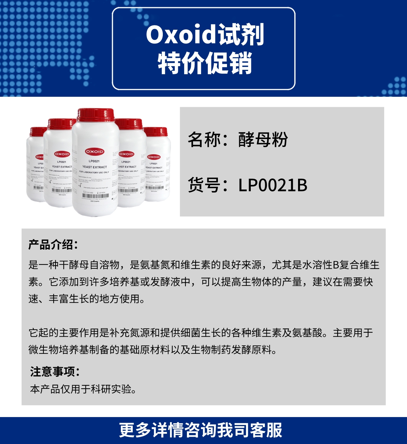 它起的主要作用是补充氮源和提供细菌生长的各种维生素及氨基酸。主要用于微生物培养基制备的基础原材料以及生物制药发酵原料。