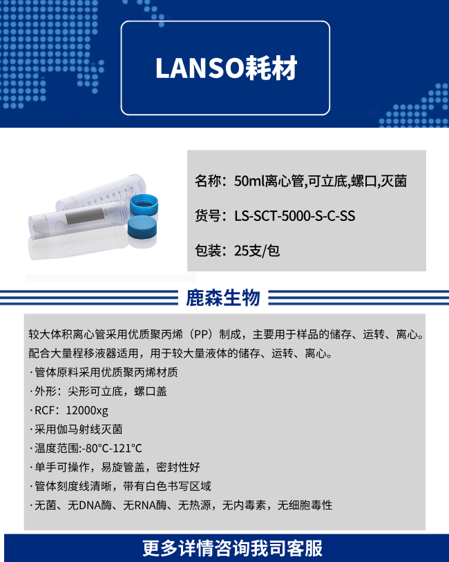 50ml离心管(泡沫架),尖底 ,灭菌,无DNA酶/RNA酶,25支/包 10包/箱