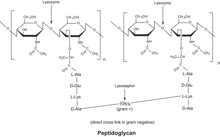 溶菌酶可水解肽聚糖中N-乙酰胞壁酸与N-乙酰-D-氨基葡萄糖残基之间以及壳糊精中N-乙酰-D-氨基葡萄糖残基之间的β(1→4)连接。 革兰氏阳性细胞对这种水解非常敏感,因为它们的细胞壁中的肽聚糖比例很高。革兰氏阴性菌就对这种水解没那么敏感,因为它们有外膜并且肽聚糖的比例较低。然而,这些细胞可能在细胞外膜中螯合金属离子的EDTA存在的情况下水解。