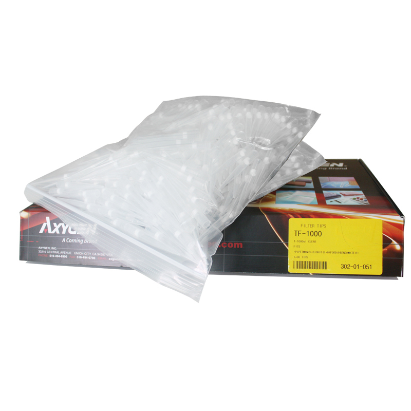Axygen Filter Barrier tips are ideal for DNA amplification and microbiological applications where trace contamination can completely invalidate results. The filter prevents cross-contamination from sample to sample by creating a physical barrier in the tip to inhibit and block aerosols. Every polyethylene filter, free from DNA inhibitors, is inserted into the tip robotically to ensure freedom from nuclease contamination. They are packaged in sealed-bottom racks with lids to prevent contamination and are available in sterilized form.