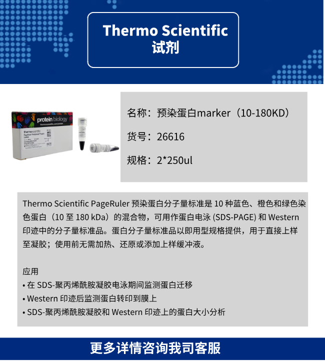 Thermo Scientific PageRuler 预染蛋白分子量标准是 10 种蓝色、橙色和绿色染色蛋白(10 至 180 kDa)的混合物,可用作蛋白电泳 (SDS-PAGE) 和 Western 印迹中的分子量标准品。蛋白分子量标准品以即用型规格提供,用于直接上样至凝胶;使用前无需加热、还原或添加上样缓冲液。