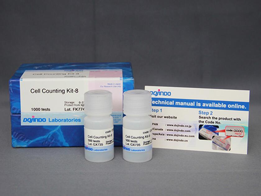 原理:该试剂中含有WST-8【化学名:2-(2-甲氧基-4-硝基苯基)-3-(4-硝基苯基)-5-(2,4-二磺酸苯)-2H-四唑单钠盐】,它在电子载体1-甲氧基-5-甲基吩嗪鎓硫酸二甲酯(1-Methoxy PMS)的作用下被细胞中的脱氢酶还原为具有高度水溶性的黄色甲瓒产物(Formazan dye)。生成的甲瓒物的数量与活细胞的数量成正比。因此可利用这一特性直接进行细胞增殖和毒性分析。